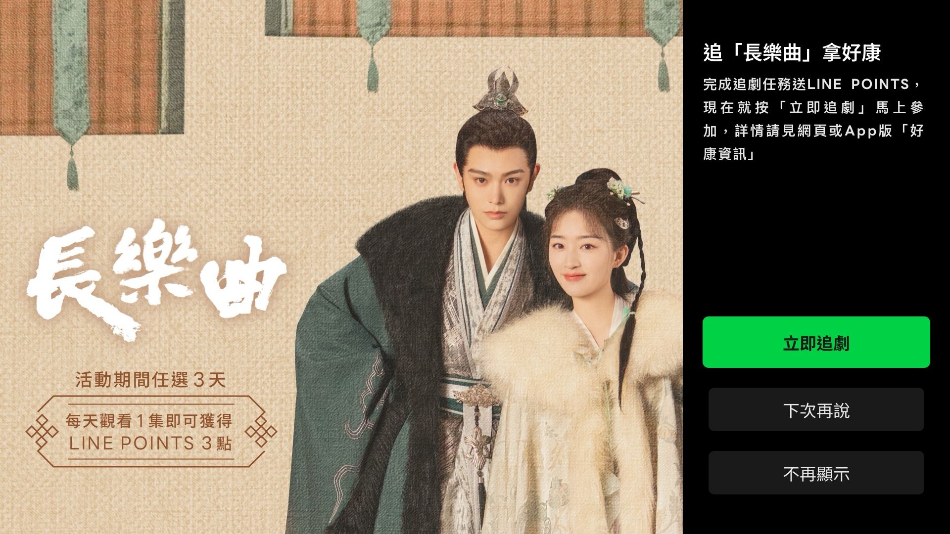 ◉參加活動不須點擊「本活動頁綠色按鈕」,觀看前請先至電視版 App ,至開機圖點選【立即追劇】按鈕完成報名,並依「得點步驟」完成活動指令後,方可獲取點數。電視版 App 係指在 Apple TV 透過 App Store 或 Android TV 透過 Google Play 安裝的 LINE TV App。