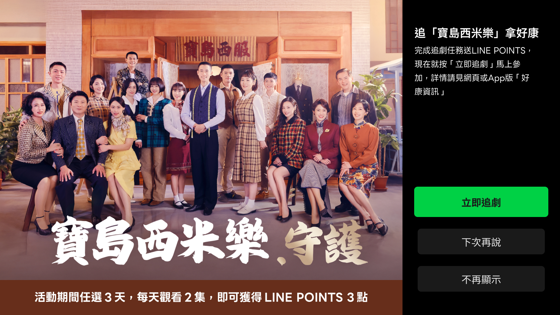 ◉參加活動不須點擊「本活動頁綠色按鈕」,觀看前請先至電視版 App ,至開機圖點選【立即追劇】按鈕完成報名,並依「得點步驟」完成活動指令後,方可獲取點數。電視版 App 係指在 Apple TV 透過 App Store 或 Android TV 透過 Google Play 安裝的 LINE TV App。